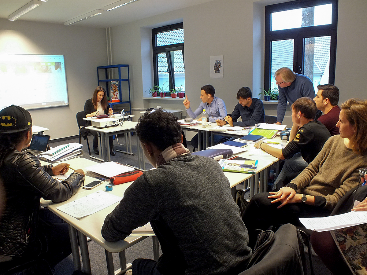 wussten nicht wofür. Wir hatten da noch kein konkretes Ziel vor Augen, wie wir das jetzt hier haben.“ Im Deutschunterricht hat die siebenköpfige Klasse heute Konjunktionen durchgenommen, und festgestellt, dass es sowohl grammatikalisch korrekt, als auch realistischer ist, „Zu lernen, damit man einen guten Job bekommt, als (erst) zu lernen, wenn man einen guten Job bekommt“.