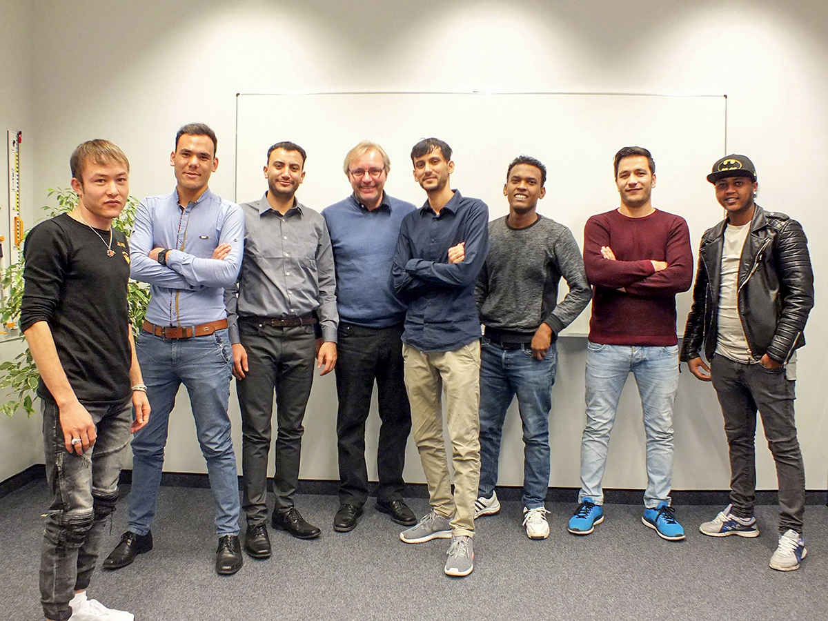 mit den Bewohner malt, Musik hört oder zusammen fern sieht.“ sagt Heimleiterin Martina Kaden bei einem von Lutjes Besuchen, bei denen er sich nach dem Wohlergehen der Geflüchteten und der Betriebe erkundigt. „Der Unterschied zu normalen Praktikanten“, fügt Franz Lutje hinzu, „macht sich eindeutig bemerkbar. Die Geflüchteten im Spracherwerb empfinden ihre Arbeit nicht als Pflicht. Sie haben einen starken Willen zu lernen, sie sind neugierig, bringen meist mehr Interesse mit als die Anderen und sind absolut bereit, sich anzustrengen“. Die Frage, wieviel Freizeit den Teilnehmern des Pilotprojekts da eigentlich noch bleibt, bei einem Schul- und Lern- oder Betriebstag von 8 bis 16 Uhr, zwischen Moscheebesuch am Freitagnachmittag und Vorbereitung auf den Praktikumsbericht wird einhellig beantwortet. Es bleibt wenig Freizeit. „Selbst wenn die Zehn in den Unterrichtswochen nach der Lernphase um 16 Uhr in ihre Wohnungen gehen, dann müssen sie aufräumen, sich ums Abendessen kümmern, einkaufen, überlegen wer putzt.“ Alles Vorgänge, die, laut Schmidt, auch zur Bildung beitragen. „Eigentlich ist es ganz logisch. Wie soll ein Geflüchteter erfolgreich Bildung genießen, wenn er nicht weiß, wo er wohnen kann, wie Lernen überhaupt funktioniert, wie die Arbeitswelt und wie ein Zusammenleben aussieht?“ Wenn es Fragen gibt, etwa bezüglich eines Briefs vom Jobcenter oder einer weiteren behördlichen Frist, die eingehalten werden muss, wenden sich die jungen Männer an Franz Lutje, der ihnen auch als Hausleiter zu Verfügung steht. Sein Büro liegt auf der Etage der WG, es ist tagsüber besetzt, es bietet immer eine offene Tür und mindestens auch ein offenes Ohr.