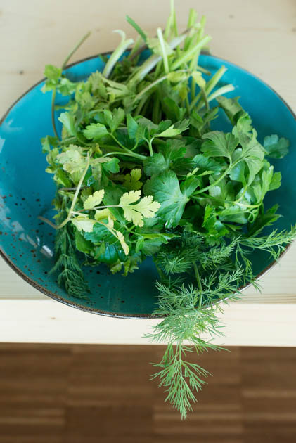 Als Maia Petersilie, Basilikum, Dill und andere Kräuter schneidet, legt sich der Geruch frischer Kräuter intensiv über den Tisch. „Dieser Duft erinnert mich sofort an das Dorf, in dem meine anderen Großeltern gelebt haben“, sagt sie.