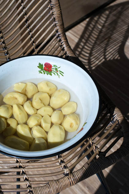 Ich fische eine gut gewässerte Zwiebel aus einer Emailleschüssel, die Tante schneidet Paprika, Maia nimmt sich die Auberginen vor. „Die verbinde ich ganz stark mit meiner Oma. Die Gegend, in der sie lebte, war ganz flach und über und über mit Steinen bedeckt“, sagt sie. Das Einzige, was man der Geröllwüste abtrotzen konnte, war dieses Gemüse.